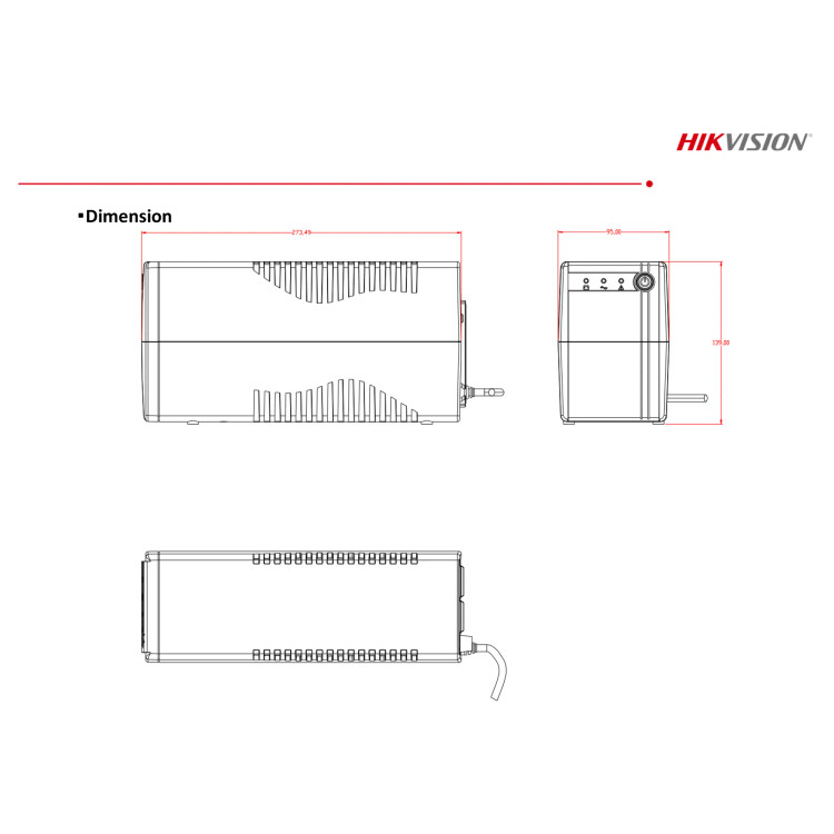 ابعاد فیزیکی این دستگاه UPS هایک ویژن مدل 1KVA برابر با 274 میلیمتر طول، 95 میلیمتر عرض و 139 میلیمتر ارتفاع است.