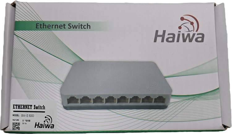سوییچ «SW-E5000 » محصولی از برند «هایوا» (Haiwa) است. این سوییچ دارای 5 پورت LAN است و میتواند برای گسترش شبکه و متصلکردن تعداد بیشتری از کاربران به آن مورد استفاده قرار بگیرد. پورتهای LAN بهکاررفته درSW-E5000 از نوع 10/100 مگابیتی هستند که این سوییچ را به انتخاب مناسبی برای شبکههای خانگی تبدیل میکنند. تمام پورتهای LAN به قابلیت Auto MDI/MDIX مجهز هستند و میتوانید از هر نوع کابل مجهز به سوکت RJ45 روی آنها استفاده کنید. با استفاده از چنین سوییچی میتوانید کامپیوتر دسکتاپ و لپتاپ، کنسول بازی خانگی، ذخیرهساز NAS و دوربینهای نظارتی منزلتان را به شبکه وصل کنید. ظرفیت سوییچینگ در این محصول یک گیگابیت بر ثانیه است و پهنای باند انتقال داده در حالت استفاده از Full Duplex Mode تا 200 مگابیت بر ثانیه خواهد رسید. LED نشاندهندهی روشنبودن سوییچ، در قسمت بالای بدنه تعبیه شده است و LEDهای نشاندهندهی فعالیت هر پورت، روی همان پورت قرار گرفتهاند. برق مورد نیاز سوییچ، SW-E5000 توسط آداپتور خارجی تامین میشود و با استفاده از Green Technology بهکاررفته درون سوییچ، میزان مصرف برق آن بسیار ناچیز است.